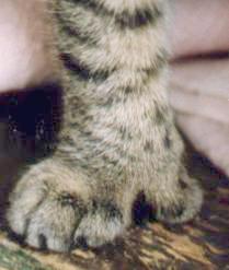 In August 2002, Dominic emailed about the appearance of "thumbs" on the back feet of a polydactyl cat. Both of his polydactyl kittens appeared to have rear thumbs with claws (which were not fully retractile, probably due to the kittens' young age). The photo above is one of Zelda Annabelle's hind feet. On closer examination, the extra hind toe is not really a thumb. To be a thumb it needs to have not only a terminal pad (the "fingertip") but also a palm pad (like the palm of a person's hand or the ball of a person's thumb). A feline "thumb" sticks out at a different angle to the other toes, like the thumb of a mitten. It can be wiggled independently of the rest of the foot. Zelda Annabelle's additional hind toes are typical of polydactyl back feet - they do not have the palm-pads and they follow the curve of the foot. Because the hind paws are constructed differently to the fore paws, there are rarely true "thumbs" on the back feet (only one or two reported cases of opposable hind thumbs, but no photographic evidence).