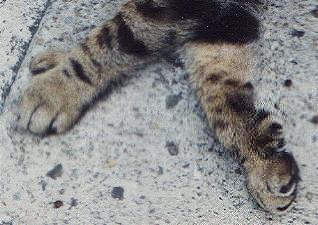 Bobbi is not the first reported 28-toe cat, but he may be the first authenticated one. Saffy, owned by Joan Snoswell, was also reported to have 28 toes. Other cats with 28 toes are Patsy, a Maine Coon adopted from the Boston Animal Rescue League, and Bigfoot, owned by Tanya Welsch. Several others are reported on the internet including 28-toed Clyde from Albuquerque, New Mexico (below), whose details were emailed to me by his owner's sister who describes Clyde's oversized paws as resembling the feet of a snowshoe hare.